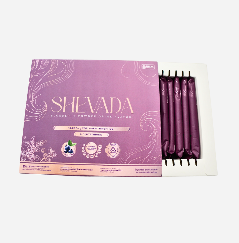 SHEVADA Collagen Drink rasa BLUEBERRY dengan 10.000 mg Fish Collagen Tripeptide, L- Glutathione 350 mg, Birdnest Extract, Vitamin A, D, E, B3, B6, B12, C, B7, ZINC.